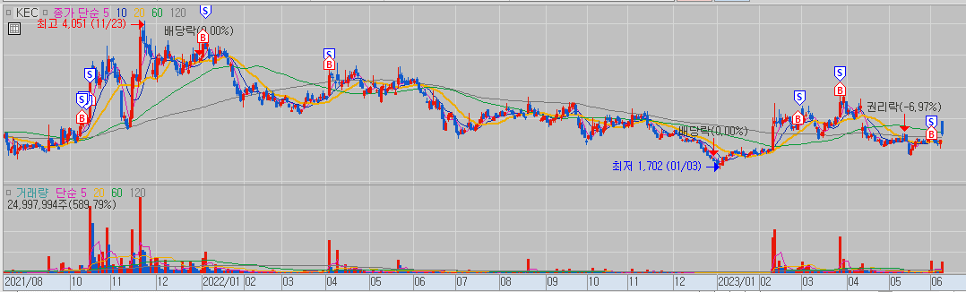 이번 포스팅에서는 KEC 주가 전망을 제가 한번 해보겠습니다. KEC는 약간 제 자랑입니다만 제가 좀 단타로 좀 많이 수익을 좀 냈었네요. 포스팅용으로 쓰는 차트는 이런 키움의 자동일지 매매 차트를 많이 쓰는데 보니까 예전에 단타로 좀 많이 수익을 냈었네요. 그 이후에는 좀 제가 관심을 안 뒀습니다만 워낙 많은 종목을 다루다 보니까 계속 봐야 되는데 이렇게 못 보는 경우도 발생합니다.