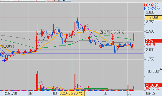 지금 크게 최근에 갭으로 띄운 다음에 떨어뜨리면서 이제 매집했다고 보이는 이 6월 1일 이전에는 그냥 돈이 들어온 적이 없어요. 그렇다 보니까 이거를 뭐 쉽게 사는 건 위험하죠. 그냥 우리가 지켜보면서 진짜 길게 보고 간다면 한번 해볼 만한 종목이긴 합니다.